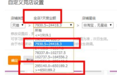 这边有个数值是,全店7天营业额,我们选两个比较极端的,比如7天店铺成交额几千到几万的,看一下数据,比如这样的(记得一定要选择无线端)