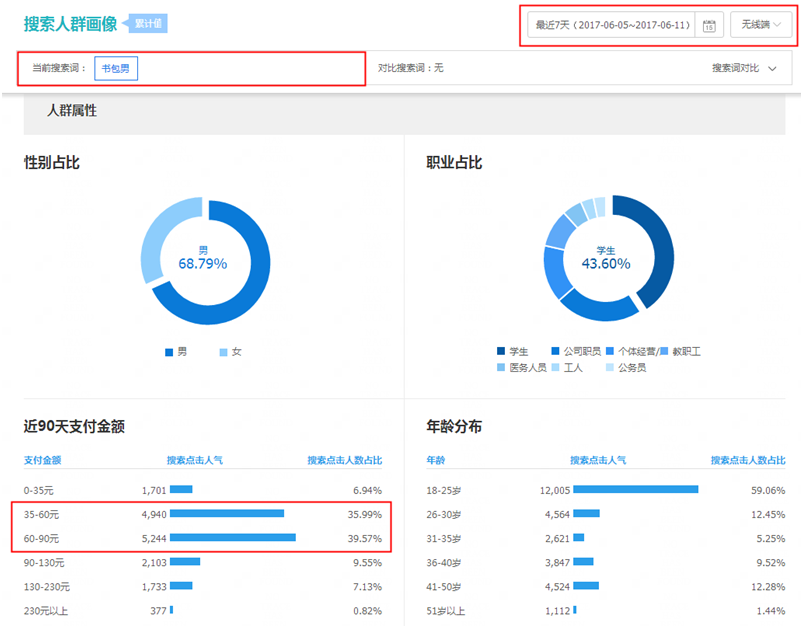 我搜索书包男 打开搜索人群画像却发现,行业下最近7天无线端 卖的最好的价位 1个是35-60元 另一个是60-90元。而他128-158的价格带搜索点击人气占比只有7%!!!
