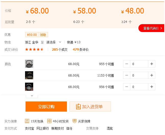 以上的东西看好后,接下来就是我们的重点了!我们要根据我们的自己的需求和市场来选择我们需要代理的物品!先要看供应商的价格,再来对比!我们是否有利润,我们能否赚到属于我们自己的那笔钱!在我们决定进货之前,我们再思考一下商品的价格。观察一下同类商品的淘宝价格,如同类商品的价格在50-65之间的趋势最好。